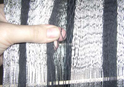 Dann ging es los. Das Bespannen des Rahmens verlief relativ problemlos, aber ich entschloss mich, die im Verhältnis zum Japansilber etwas dünnere Seide in der Fadenzahl zu erhöhen und 20 statt 15 Fadenpaare zu verwenden.