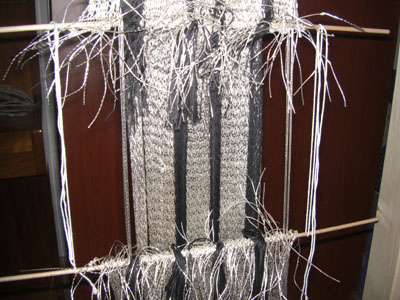 Bereits während der Fertigung wurde mir klar, dass ein dünnerer Silberfaden besser gewesen wäre – einmal wäre damit die Originalbreite der Schärpe besser erreicht worden, des Weiteren hätte das Ganze ein ausgeglicheneres und dichteres Sprangbild ergeben (Bild von den Maschen, siehe vorheriger Post). Nun war aber auch nichts mehr daran zu machen. Manches lernt man halt durchs Tun.