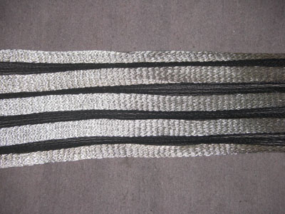Schließlich war die Kette unten und rollte sich dann auch erwartungsgemäß durch den Drall der Verdrehungen wie eine Schillerlocke zusammen. Auch hier kamen weitere Erkenntnisse hinzu: während sich das schwere und dicke Silber kaum dehnte, dehnte sich die „schwächere“ Komponente Seide umso mehr und ergab besonders in der Mittelregion unschöne große Maschen. Hier erkannte ich, warum die Originale silberdurchwirkte Seidenstreifen hatten. Das Silber versteifte und verstärkte die Seide vermutlich so sehr, dass der Dehnungseffekt bei beiden Streifenarten in etwa gleich war. Verstärkt wurde dieser Dehneffekt vermutlich auch noch durch den deutlichen Stärkenunterschied von Silber und Seide. Dennoch: Die Optik der ausgebreiteten und verflachten Schärpe stimmte.